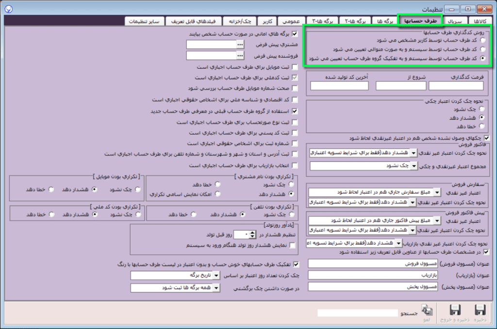 در تصویر زیر می توانید بخش مربوط به کدینگ طرف حساب در نرم افزار حسابداری آرپا در منوی تنظیمات را مشاهده نمایید.