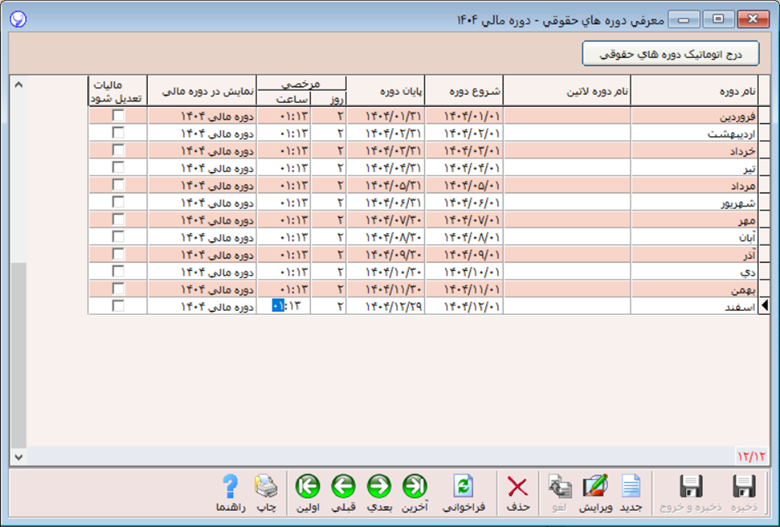در اولین مرحله کاربر باید در سال مالی 1404 به برگه معرفی دوره های حقوقی مراجعه نماید و با کلیک بر روی گزینه درج اتوماتیک دوره های حقوقی، دوره های جدید در سال 1404 را ایجاد نماید. در این برگه کاربر باید مرخصی مجاز هر ماه را نیز وارد کند.