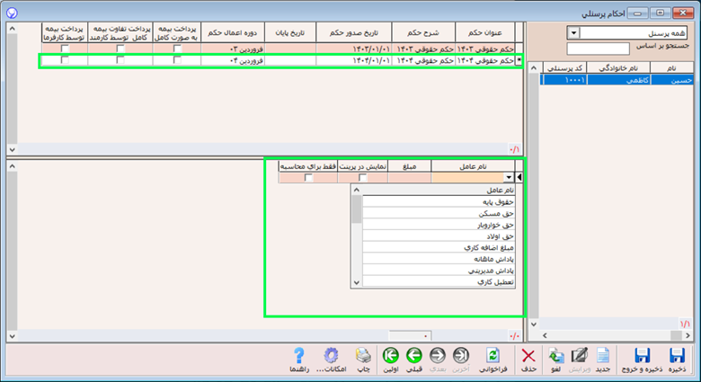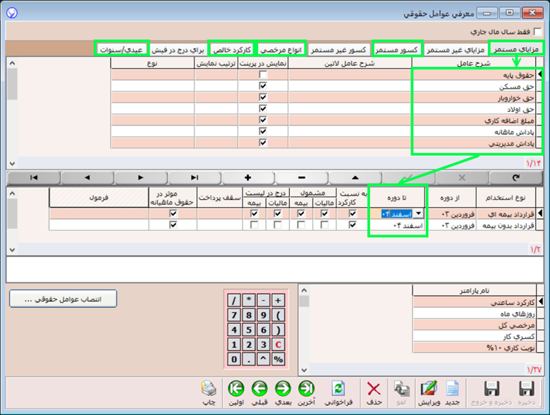اولین تغییر مهم در زیر سیستم حقوق و دستمزد جهت محاسبه حقوق سال جدید، تمدید بازه زمانی عوامل حقوقی می باشد. برای این کار می توانید از طریق برگه معرفی عوامل حقوقی برای تمامی عوامل در تب مزایا و کسورات مستمر، تب انواع مرخصی و کارکرد خالص، از طریق فیلد “تا دوره” آن را تا اسفند 1404 تمدید کنید.