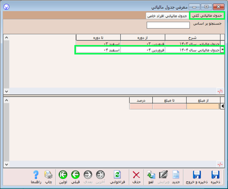 با شروع سال جدید کاربر در زمان راه اندازی حقوق و دستمزد آرپا باید جدول مالیاتی حقوق 1404 را تعریف نماید تا بر اساس آن مالیات حقوق پرسنل شناسایی گردد. برای این کار کاربر می تواند در بخش معرفی به برگه معرفی جدول مالیاتی رجوع کند و جدول مصوبه مالیات سال 1404 را وارد کند.